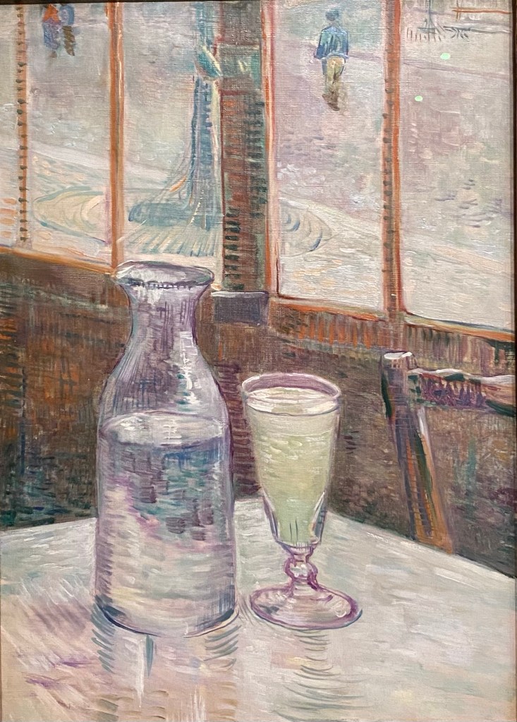 接着是著名的向日葵,黄色从明到暗,充满了不安的冲突又意外地和谐。同样的,他的线条粗粗扭扭,带着童真和稚气,我总不时感叹怎样一颗心灵能创造出如此有想象力的画面。进门处那幅破旧的靴子歪歪扭扭摆在那里,我仿佛陪鞋子的拥有者度过了几年辛苦的矿工生活。旁边小小的一幅静物洋葱,紫色蓝色和黄色短小线条布满canvas,旁边的montmartre也是用短小的紫色蓝色线条勾勒阴影,近看几乎都是排列整齐的线条,远远才能看出fence、树木、阴影和光。印象深刻的有一瓶水,桌上充满了环形线条,仿佛能看到空气和液体的流动。黄房子比奥赛那幅大不少,海浪像是朝我涌来。我向来不太喜欢静物,然而梵高的静物充满了动感和叙事感,除了技术上有很多值得细细观摩的部分,那扑面而来的强烈情感冲破canvas,让人由不得被吸引。