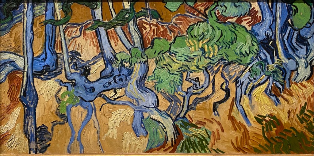 特展之丰富让我越看越精神,接着是他在saint Rémy时期的作品,大量landscape,其中有我非常喜欢的礼拜堂。最后几幅画都是长方形的langscape,是梵高在精神疗养院完成的。即便没读过梵高传记,那幅黑夜金黄色麦田上起飞的乌鸦都满载苦闷。他直到生命的最后一天都保持着一天一幅的创作频率,倒数第三幅大概是画完不满意,烦躁地划了许多线想要抹去。站在梵高生前最后一幅three roots前,关于人生最后一刻的问题让我无暇继续理解和欣赏:在人生的最后一刻,我的遗憾会是什么,会后悔什么,还想要抓住什么。